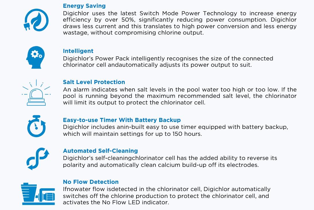 Digichlor uses the latest Switch Mode Power Technology to increase energy efficiency by over 50%, significantly reducing power consumption. Digichlor draws less current and this translates to high power conversion and less energy wastage, without compromising chlorine output.