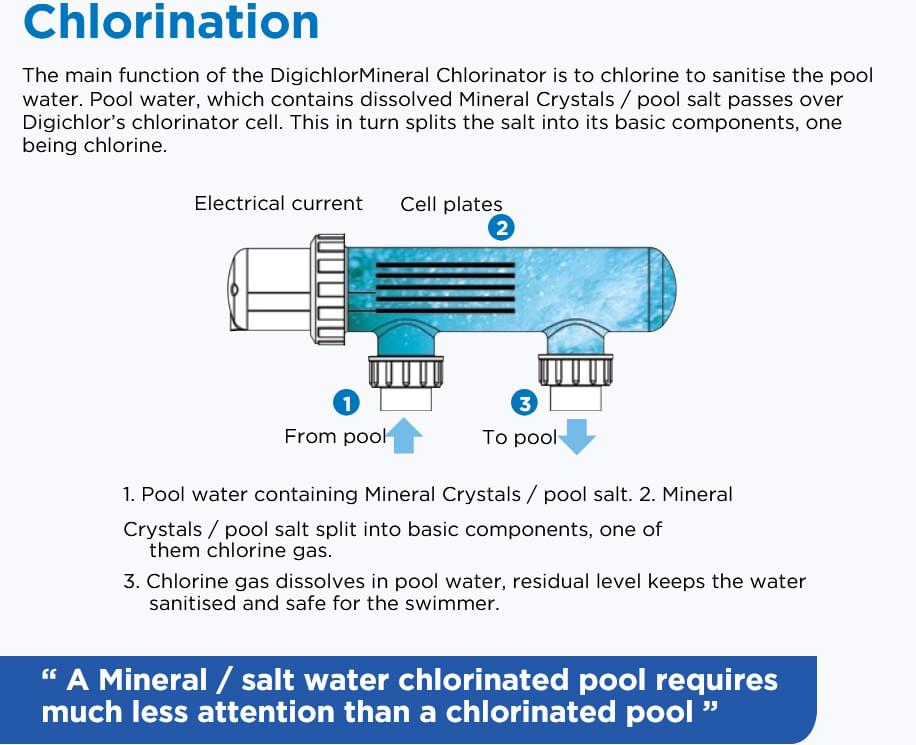 A salt chlorinator produces chlorine the same way a chlorine factory does. The difference in the process is that it is manufactured in your pool by passing an electric current through a solution of brine (common Mineral Crystals / salt dissolved in water).